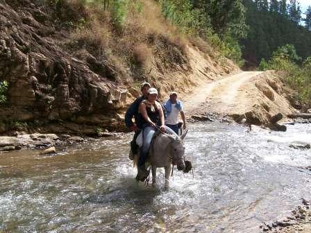 Aura Cruz, Jaime Obando and Pablo Somarriba cross a stream during study of the Golden-cheeked Warbler.